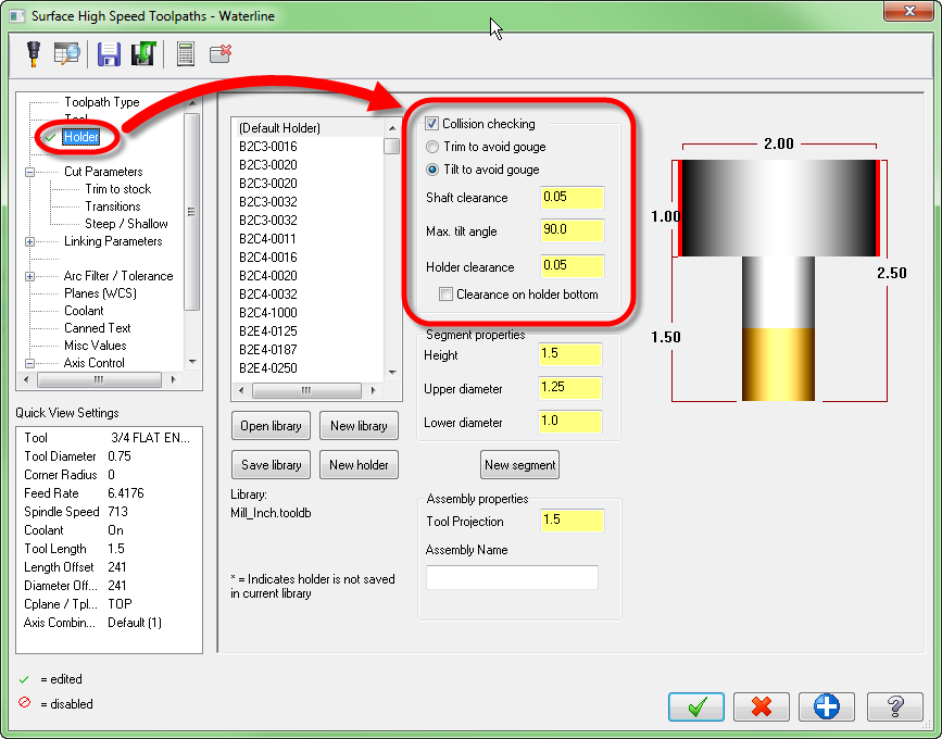 This setting will cause the toolpath to tilt the tool away if the shank of the tool or the holder is going to collide with the wall of the object. This makes it extremely easy to use the shortest tool possible to machine the part, giving you the best finish possible.